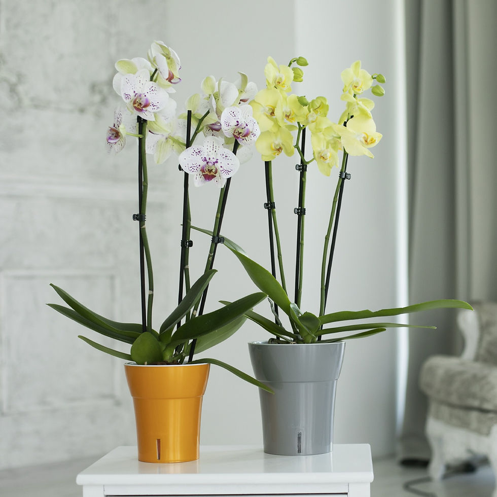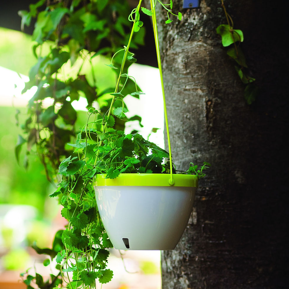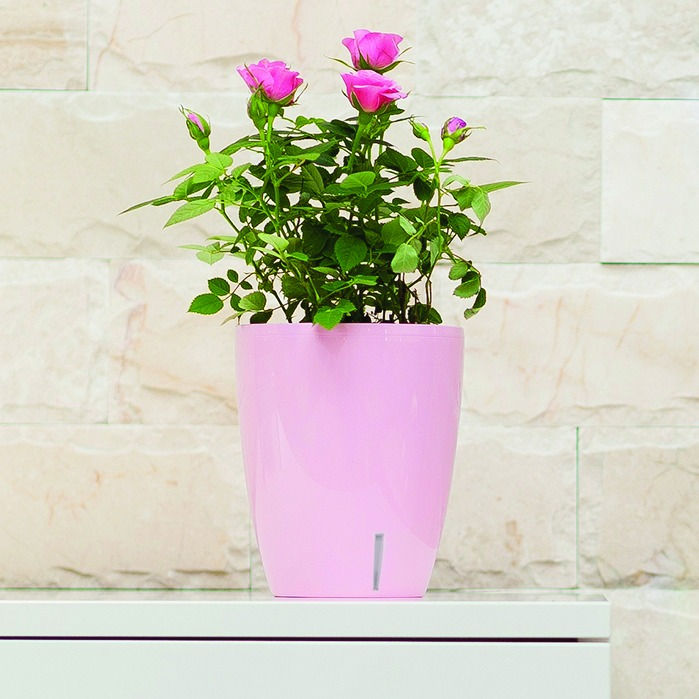 Система фитильного автополива. Внутренний вазон с дренажными отверстиями, внешний - с резервуаром для воды и прозрачными окошком для контроля уровня влажности. Фитиль для автополива обеспечивает оптимальную влажность корней.